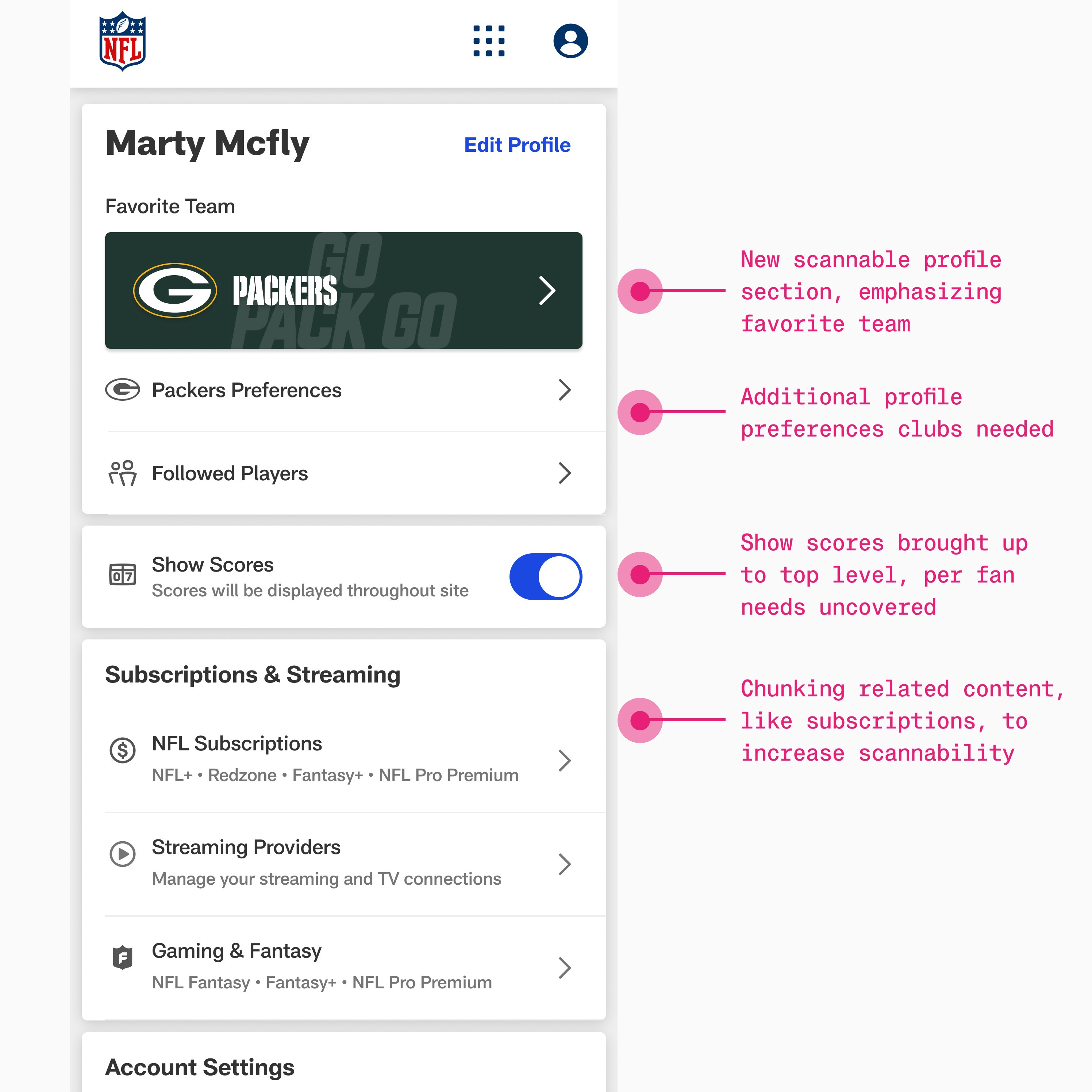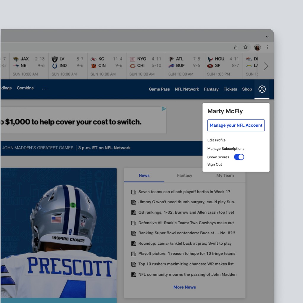Unified sign-up and account management across ~70 league and club properties, reducing friction, increasing fan satisfaction, and enabling NFL+.
