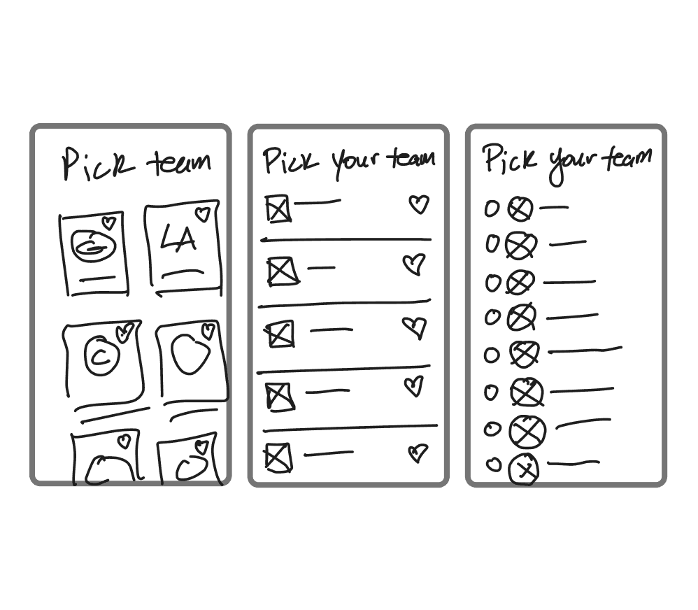 From divergent sketches to production-ready system component. Favorite team cards were a new addition to the Facemask design system that added brand personality to a fan-favorite feature, now an optional step immediately after account creation.