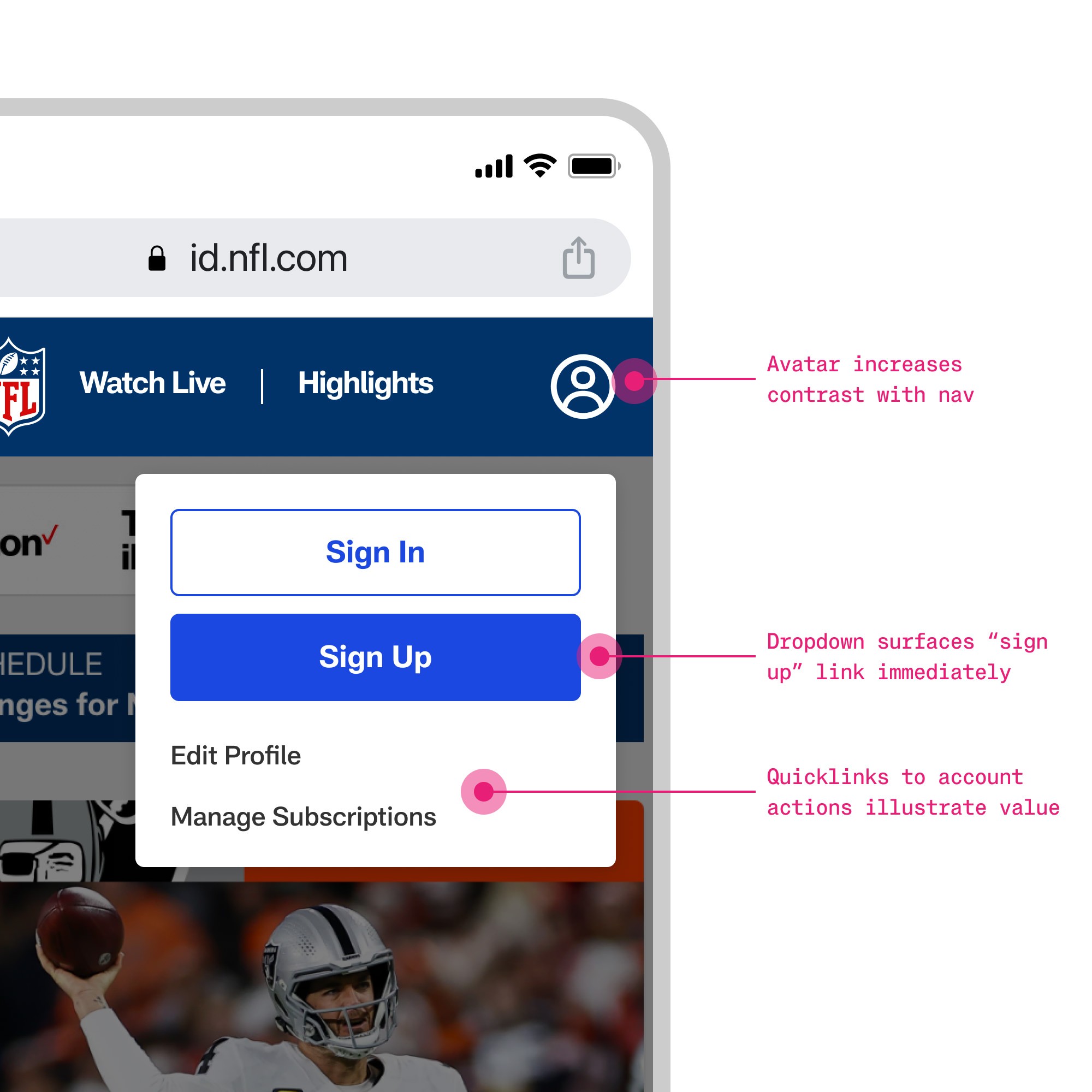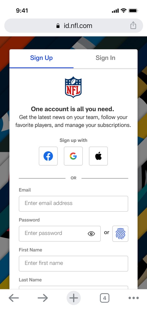 The sign-up form was embedded in the NFL+ purchase flow, meaning high stakes for conversion. Industry research pointed toward multi-step progressive disclosure, but a domain expert revealed direct competitors saw a 60% dropoff with that approach. We pivoted to minimum viable signup: a single form with required fields only. Optional fields were moved to post account creation.