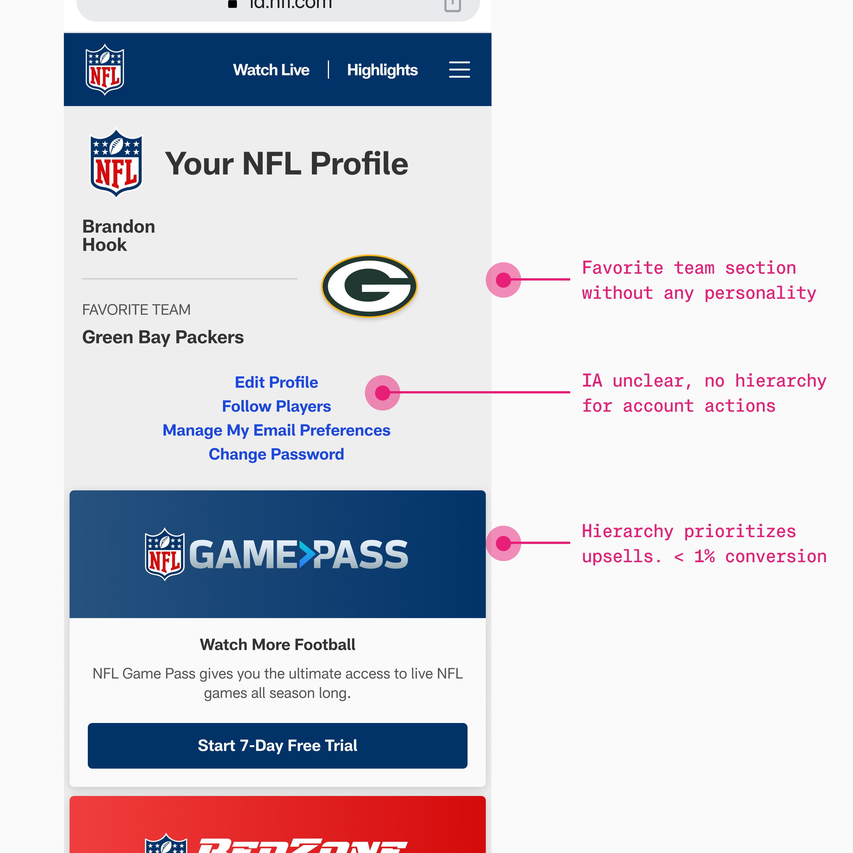 Fans juggled up to five accounts across NFL properties. Signup was slow, fragmented, and offered little value. It was a blocker for NFL+, loyalty programs, and CRM.