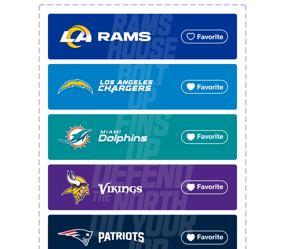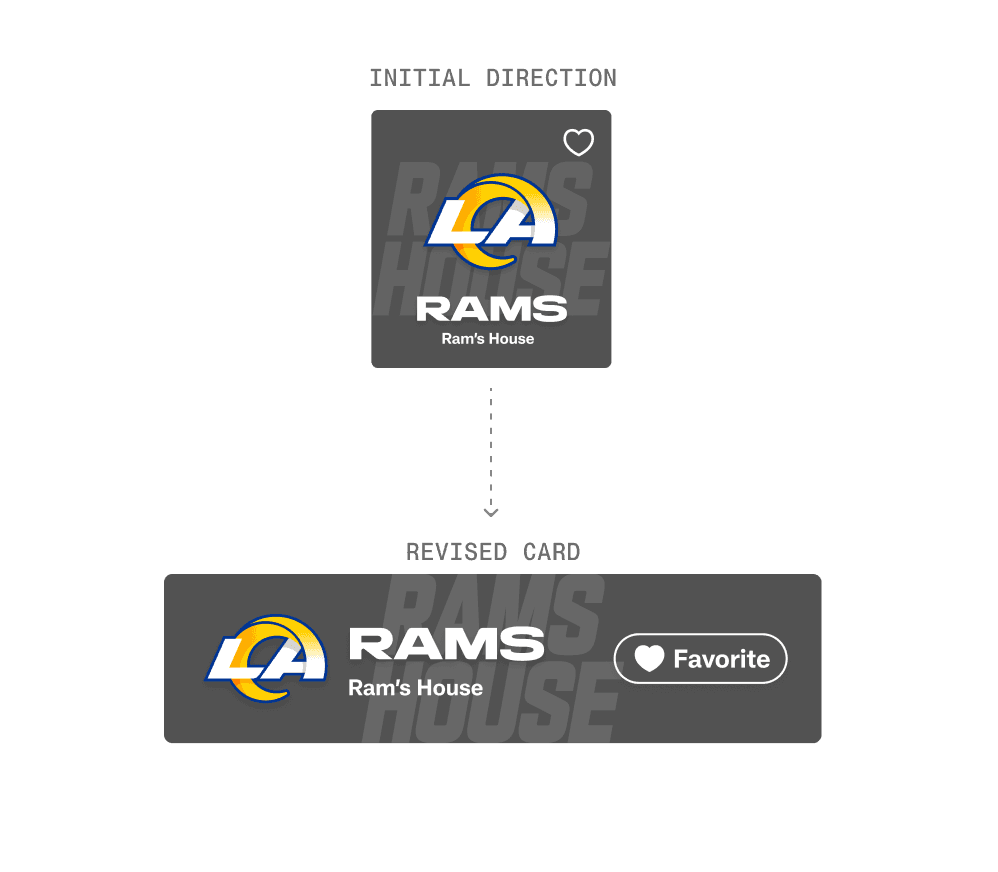 Horizontal layout tested better for scannability. Clearer 'Favorite' state. Supports all 32 team brands.